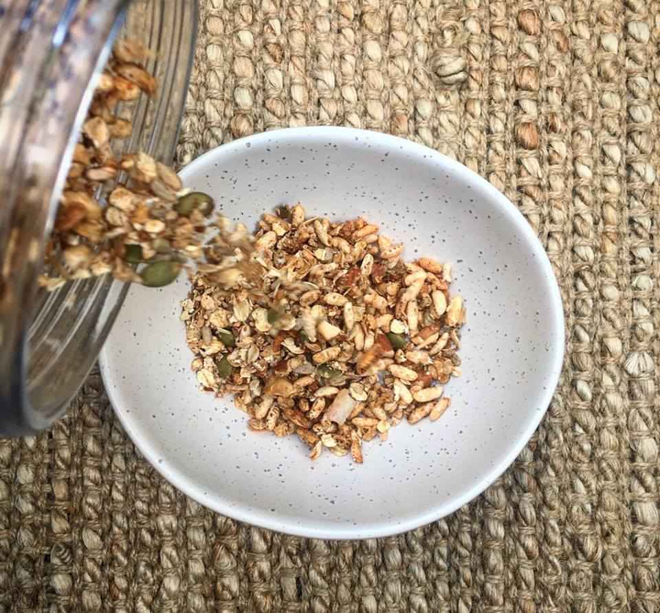 This healthy maple granola works great as a cereal replacement. If you're a little time poor in the mornings, you can just pour some milk over the top. However, my favourite way to consume it is to sprinkle it over the top of some yoghurt or a smoothie bowl. It can also be consumed by itself as a healthy snack throughout the day!